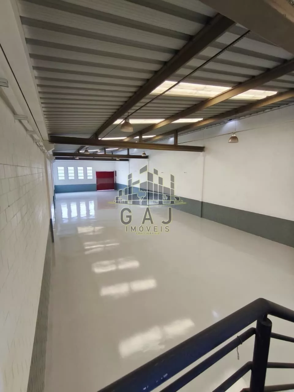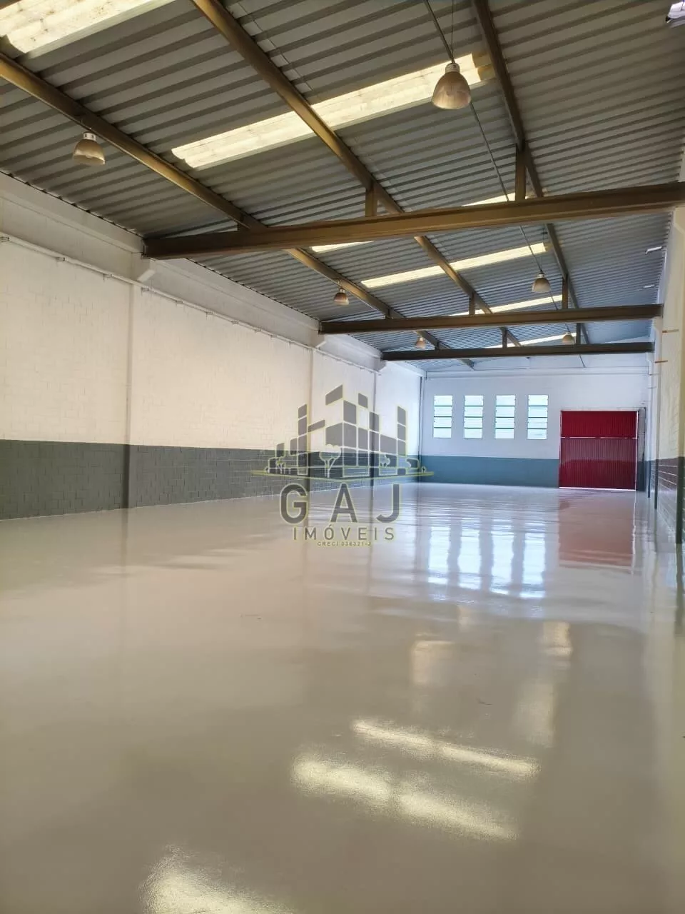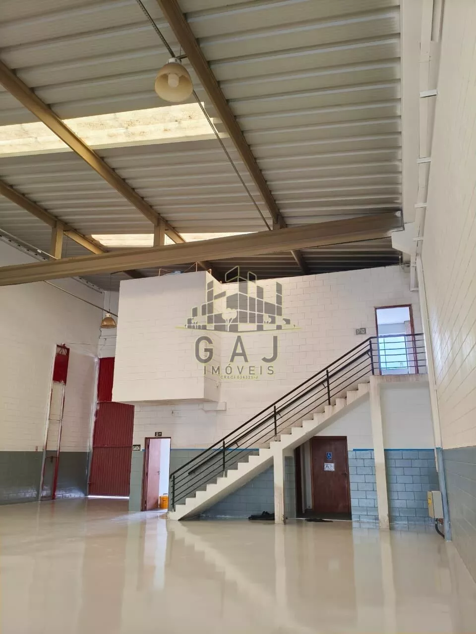 Salão plano, com pé direito de aproximadamente 9 metros, piso industrial com epóxi novo, recepção com banheiro, vestiários, escritório superior com banheiro.