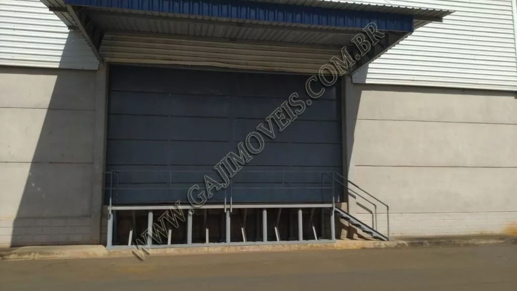 Entrada para carga e descarga em doca, local para descanso de motorista com banheiro e sala de descanso.