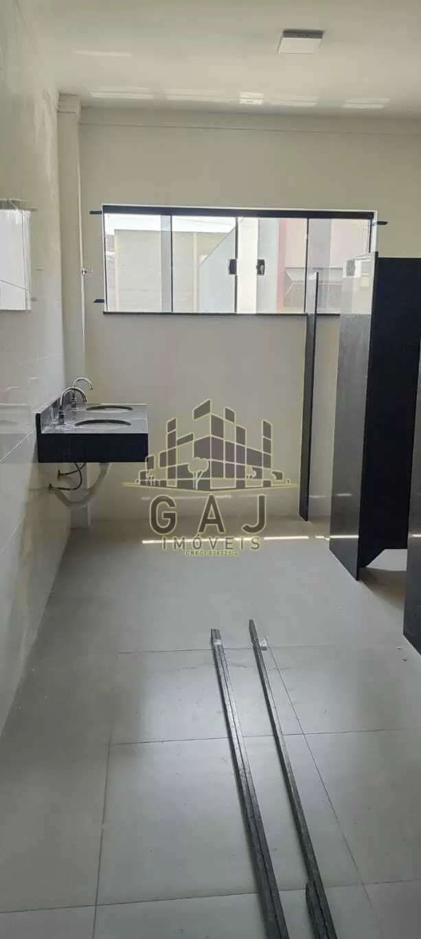 Portão de 6 metros por 4,5, ampla entrada de salão. Area de escritório em segundo piso com 02 banheiros, parte inferior com vestiários masculino e feminino.